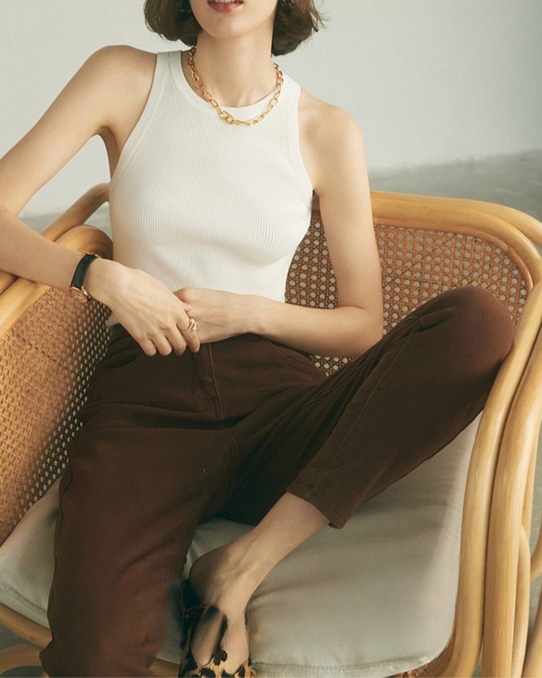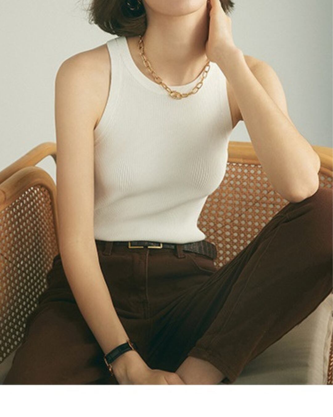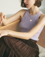 どんなスタイルにも合わせやすい、シンプルなノースリーブトップ。