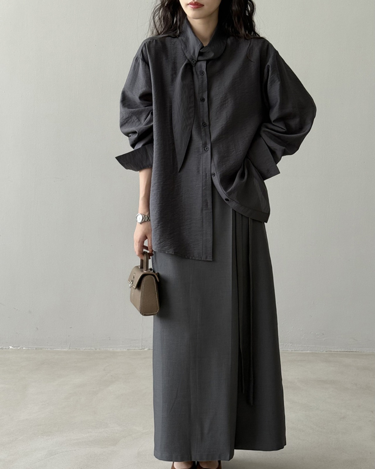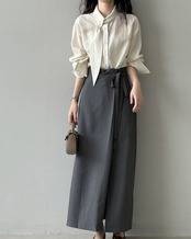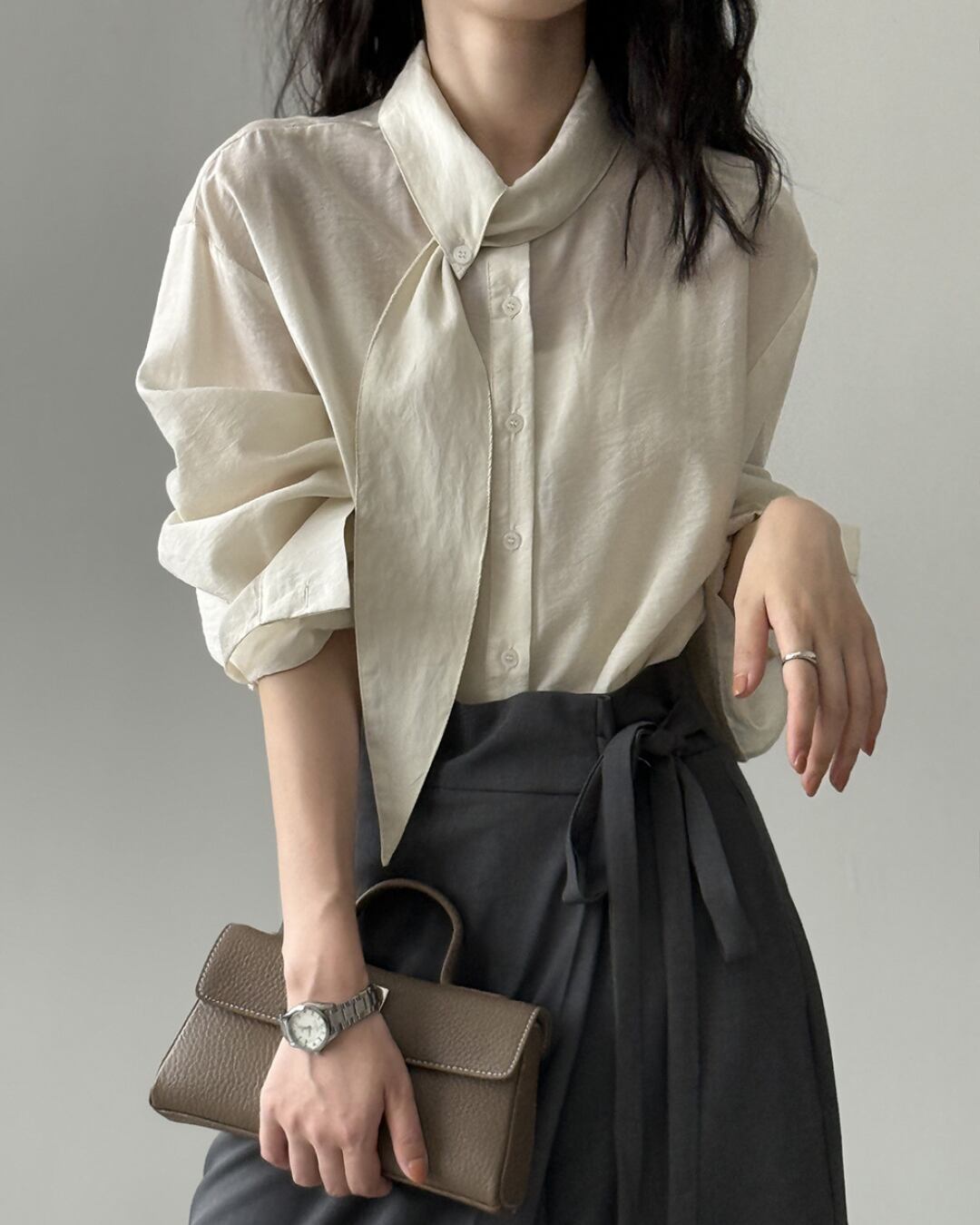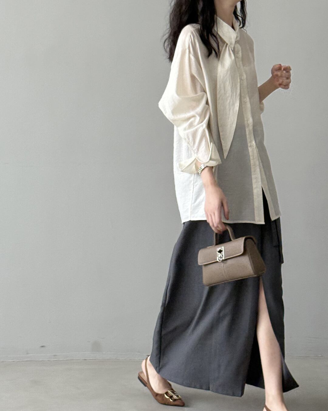 こなれ感のあるロングスリーブシャツで、大人の女性らしさを演出。