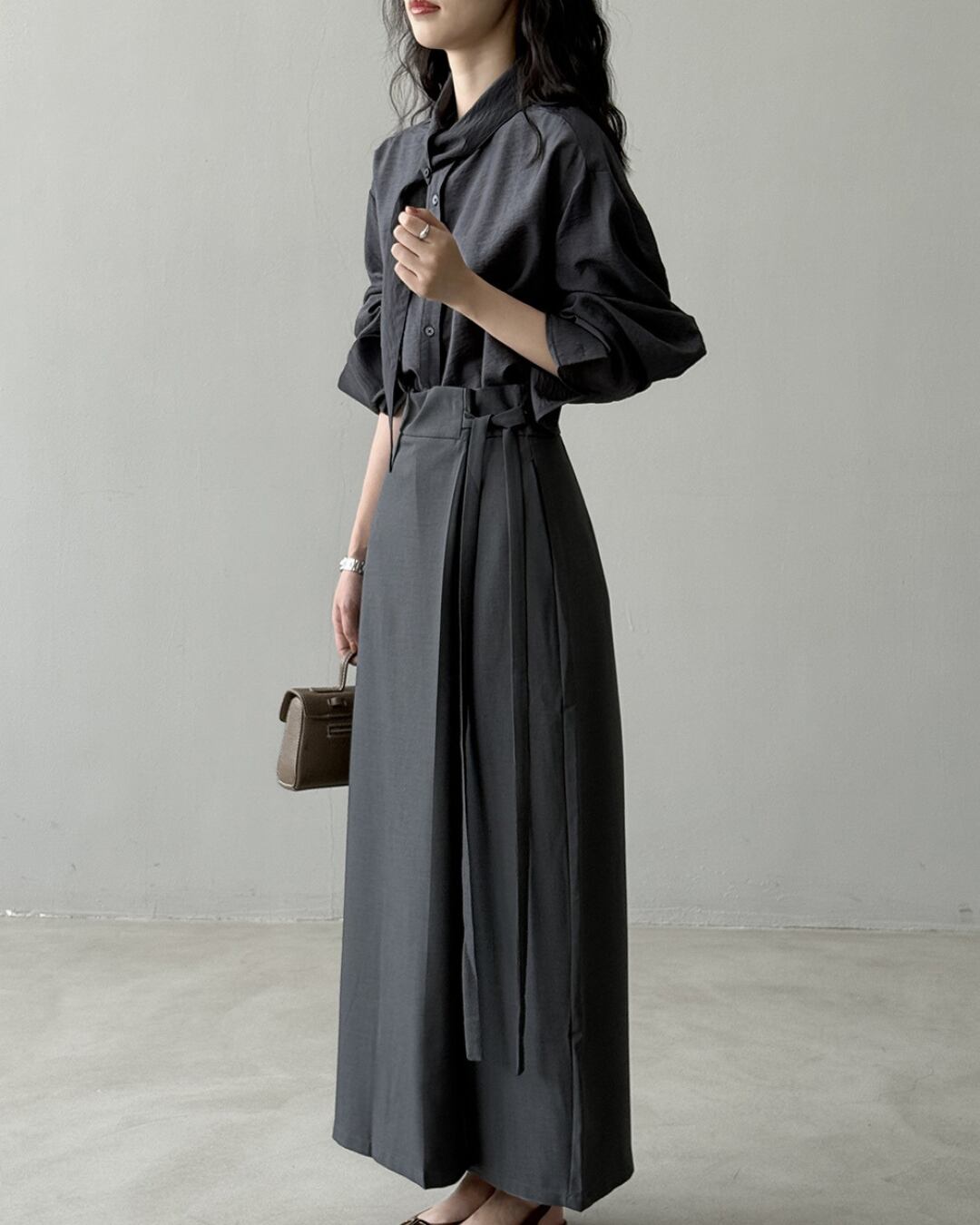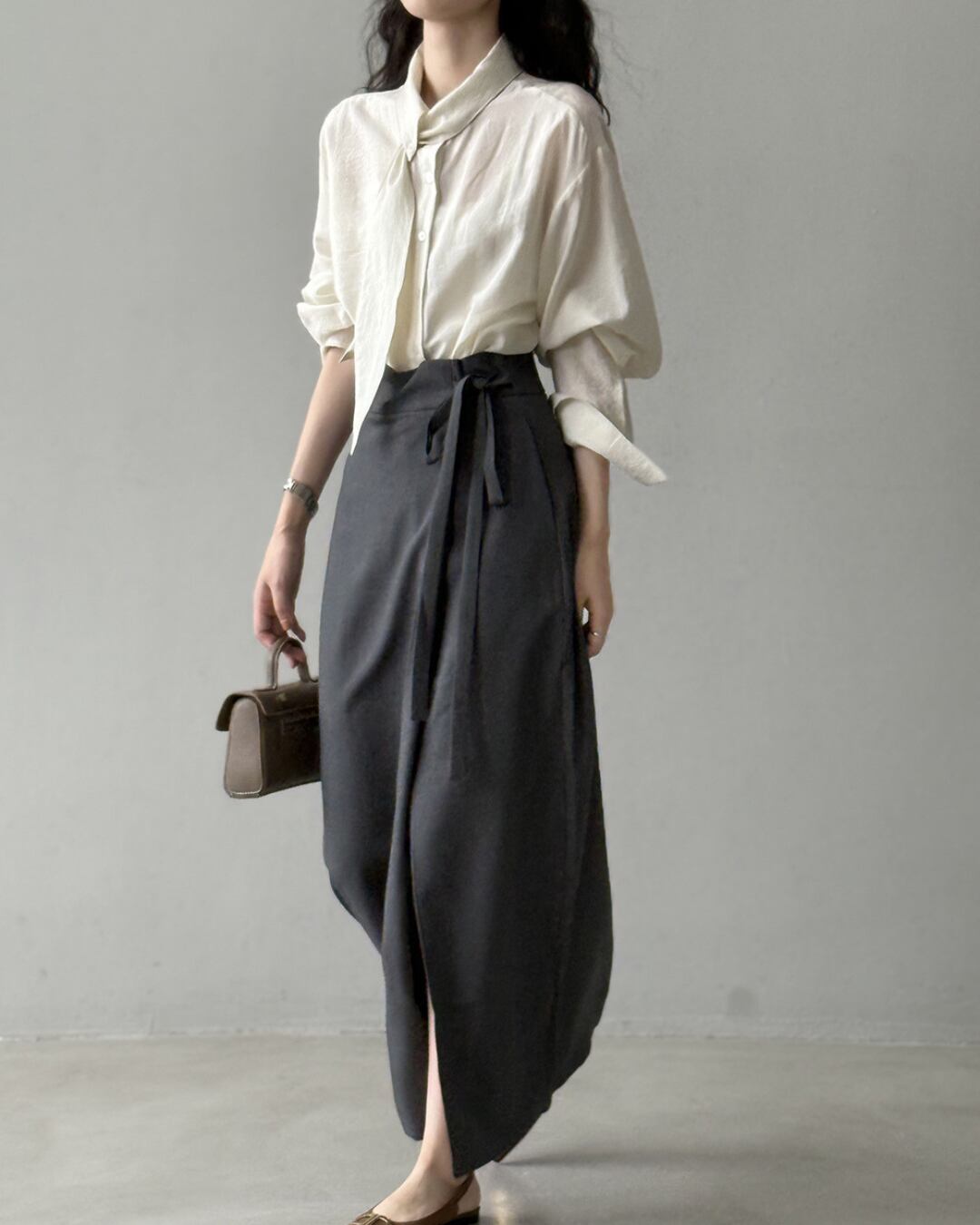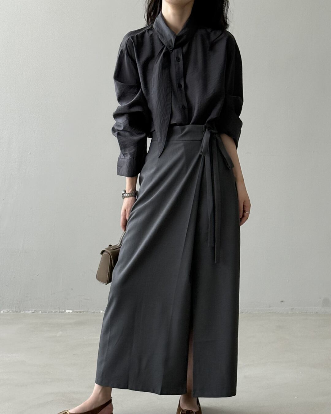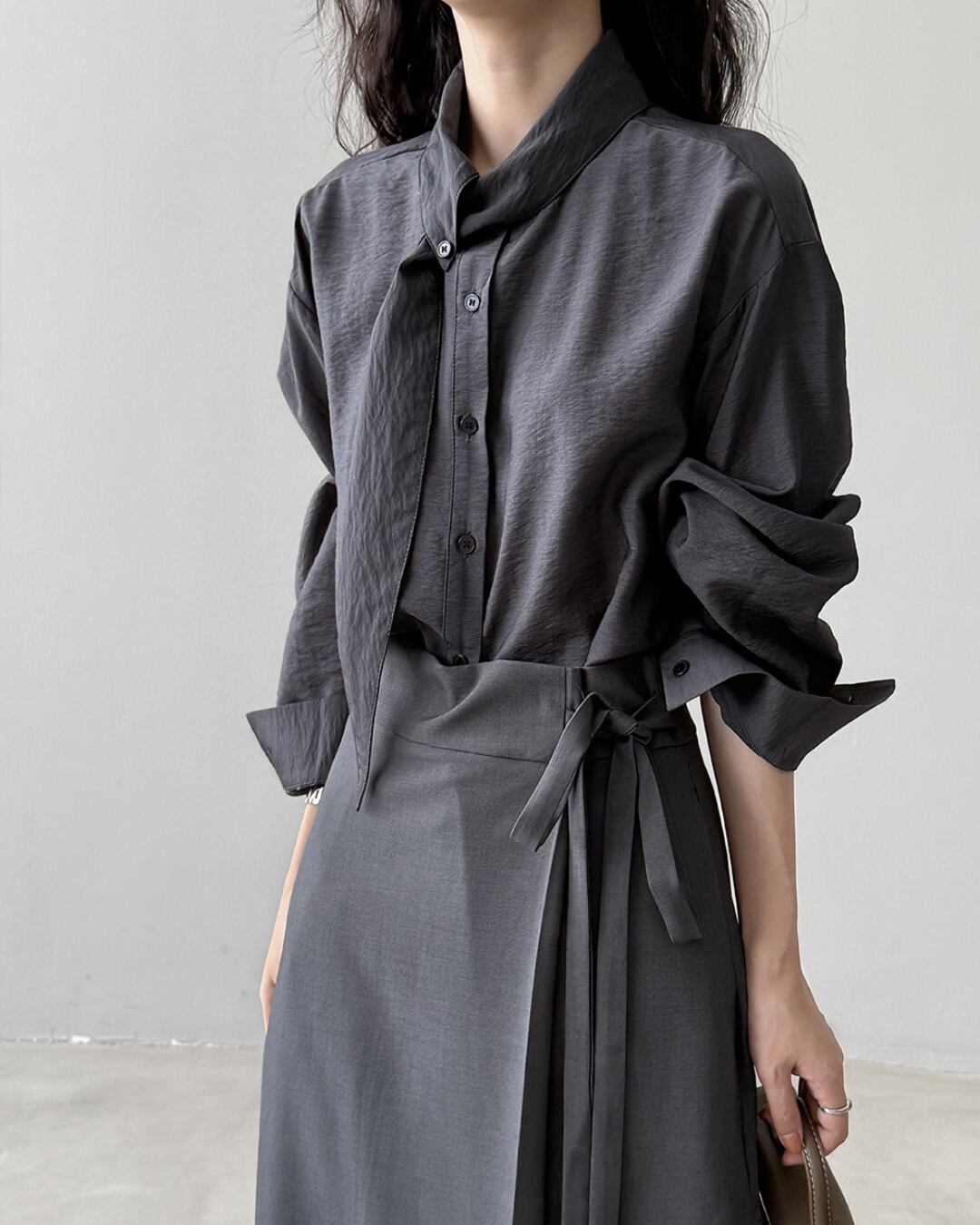 こなれ感のあるロングスリーブシャツで、大人の女性らしさを演出。