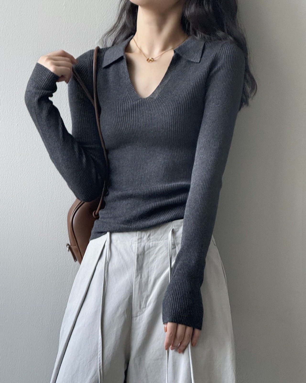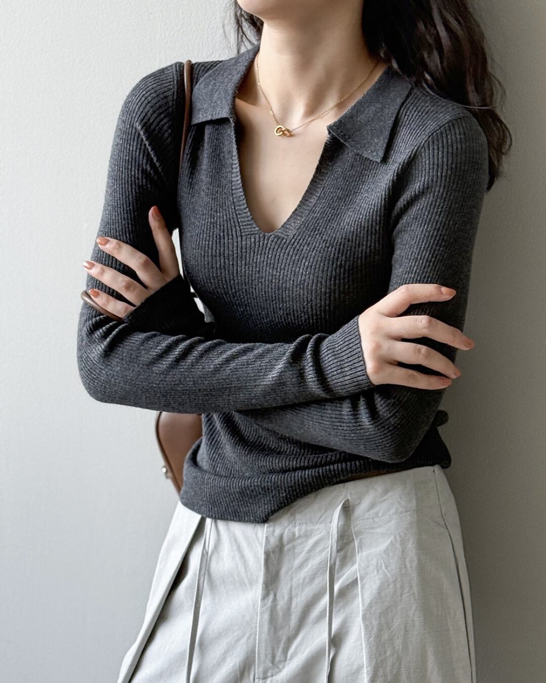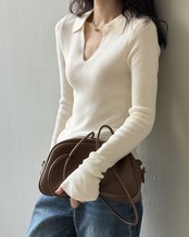 Ribbed V-neck Long Sleeve Knit / Polo Collar Cuff Sweater S00026