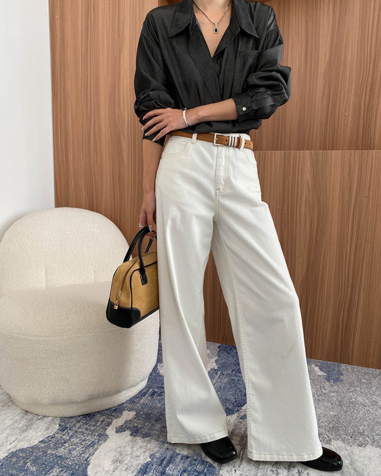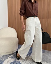どんなスタイルにも合わせやすい、万能なハイウエストワイドレッグデニムパンツ。