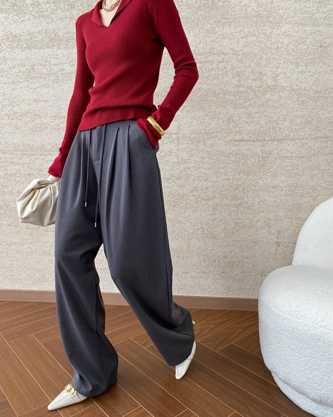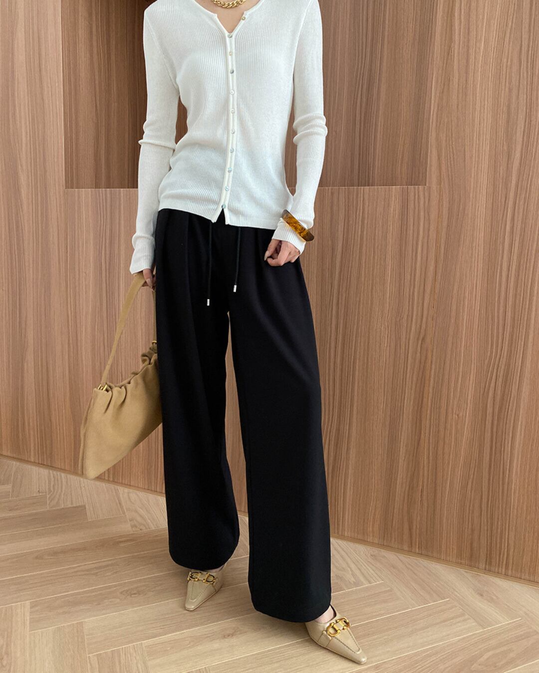 シンプルなトップスを合わせるだけで、洗練された着こなしが完成します。
