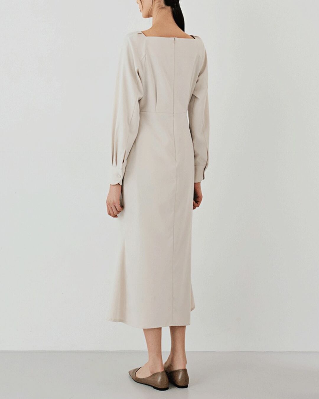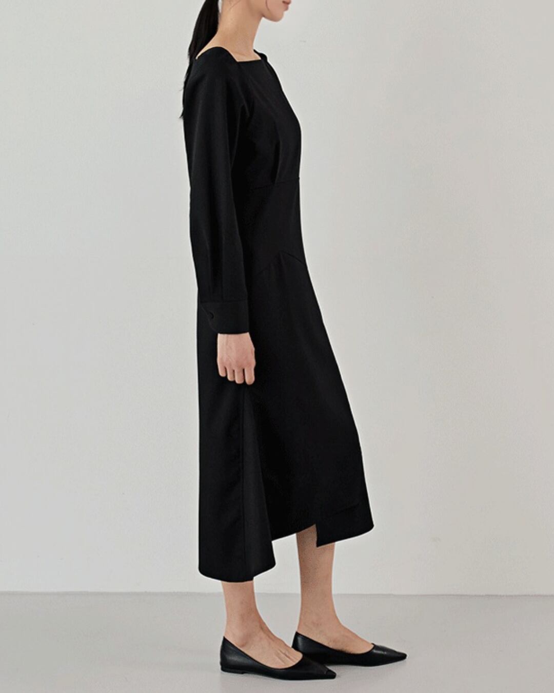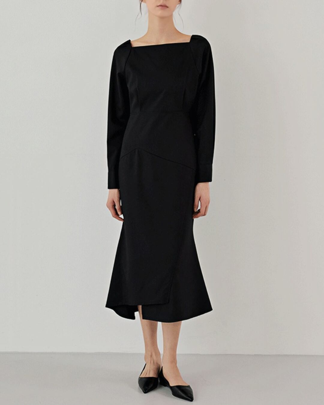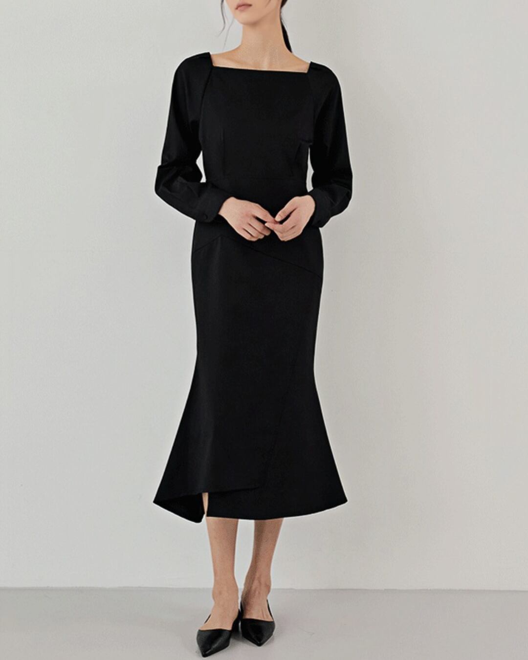 スクエアネックとロングスリーブが洗練された印象を与える、Aラインフレアスカートのワンピースです。