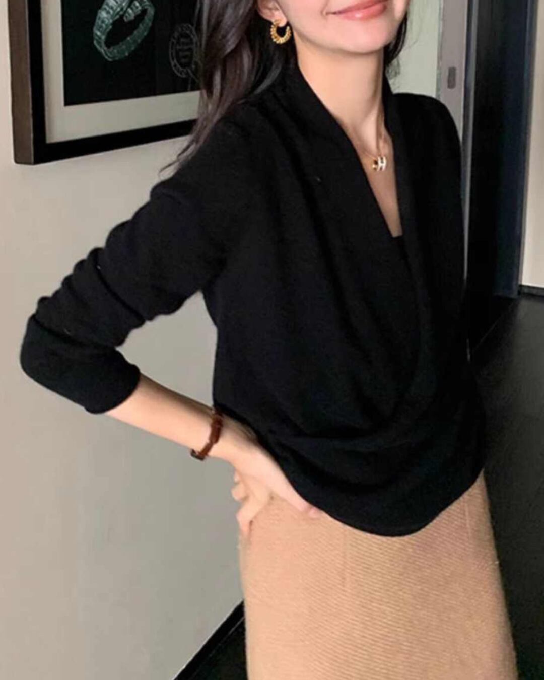 Vネックとロングスリーブが、女性らしい上品さを演出します。