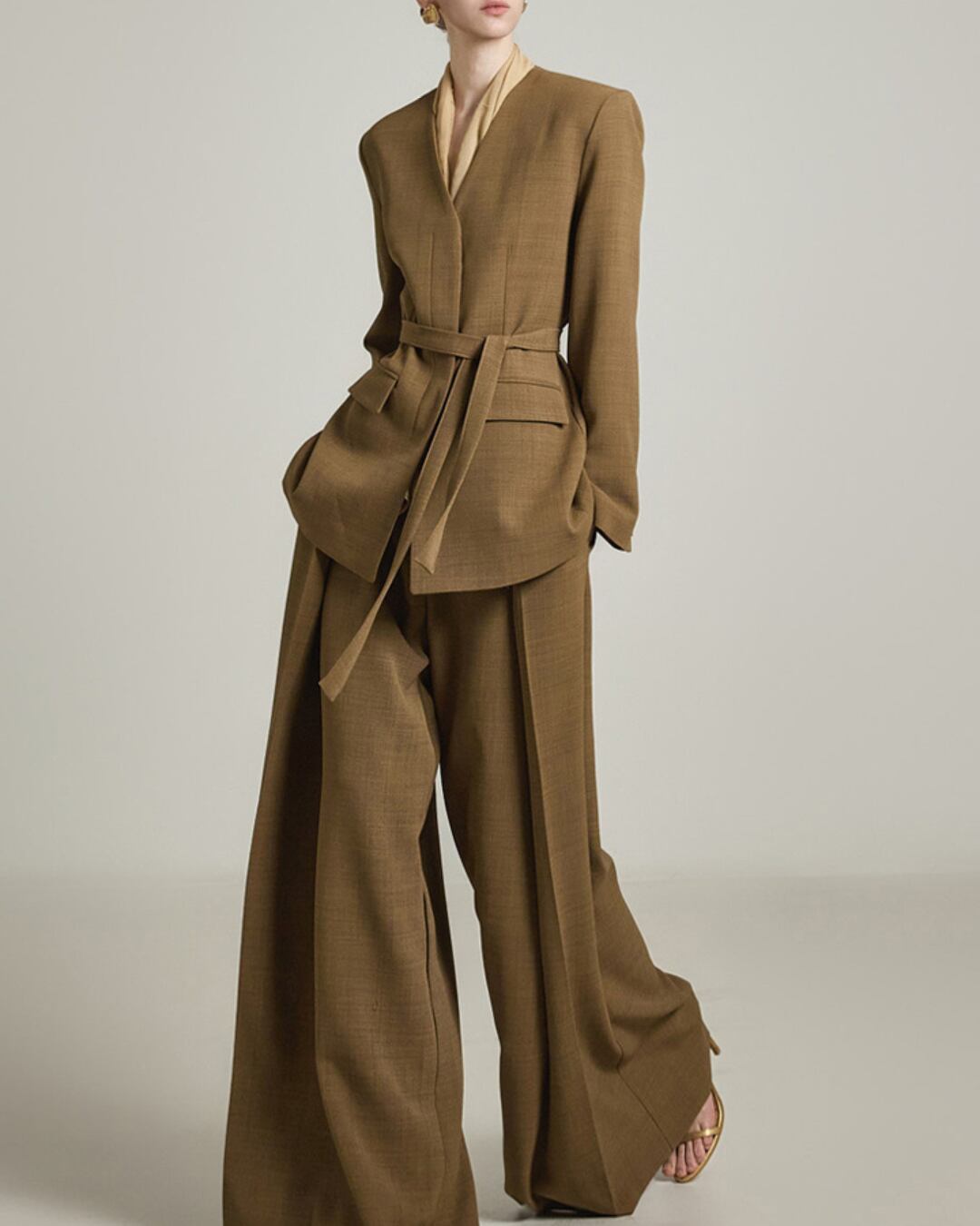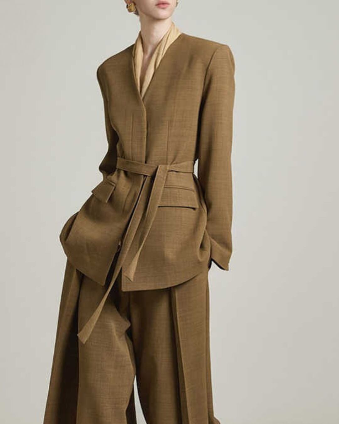 Vネックデザインとウエストをマークするベルトが、女性らしいシルエットを演出します。